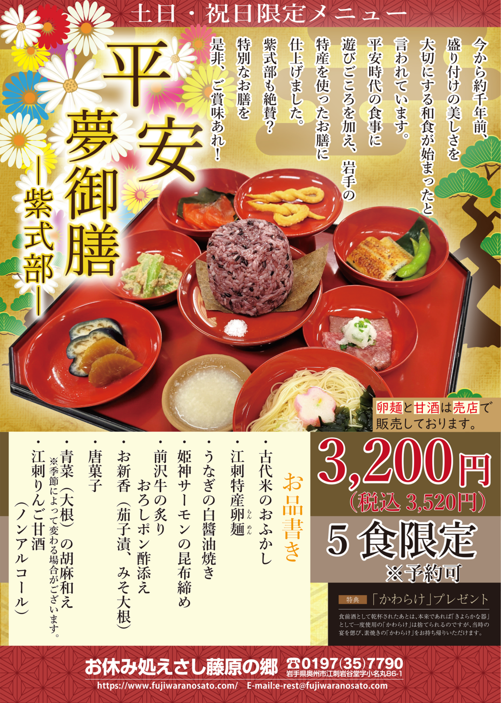 時代食をアレンジ🎎「平安夢御膳」の提供についてレストラン清衡でご好評をいただいております「平安夢御膳」 土・日・祝日限定のメニュー。限定5食です。 平安時代に思いをはせながら、この機会にぜひご賞味ください🎎 ▶予約申し込み ☎0197-35-7790